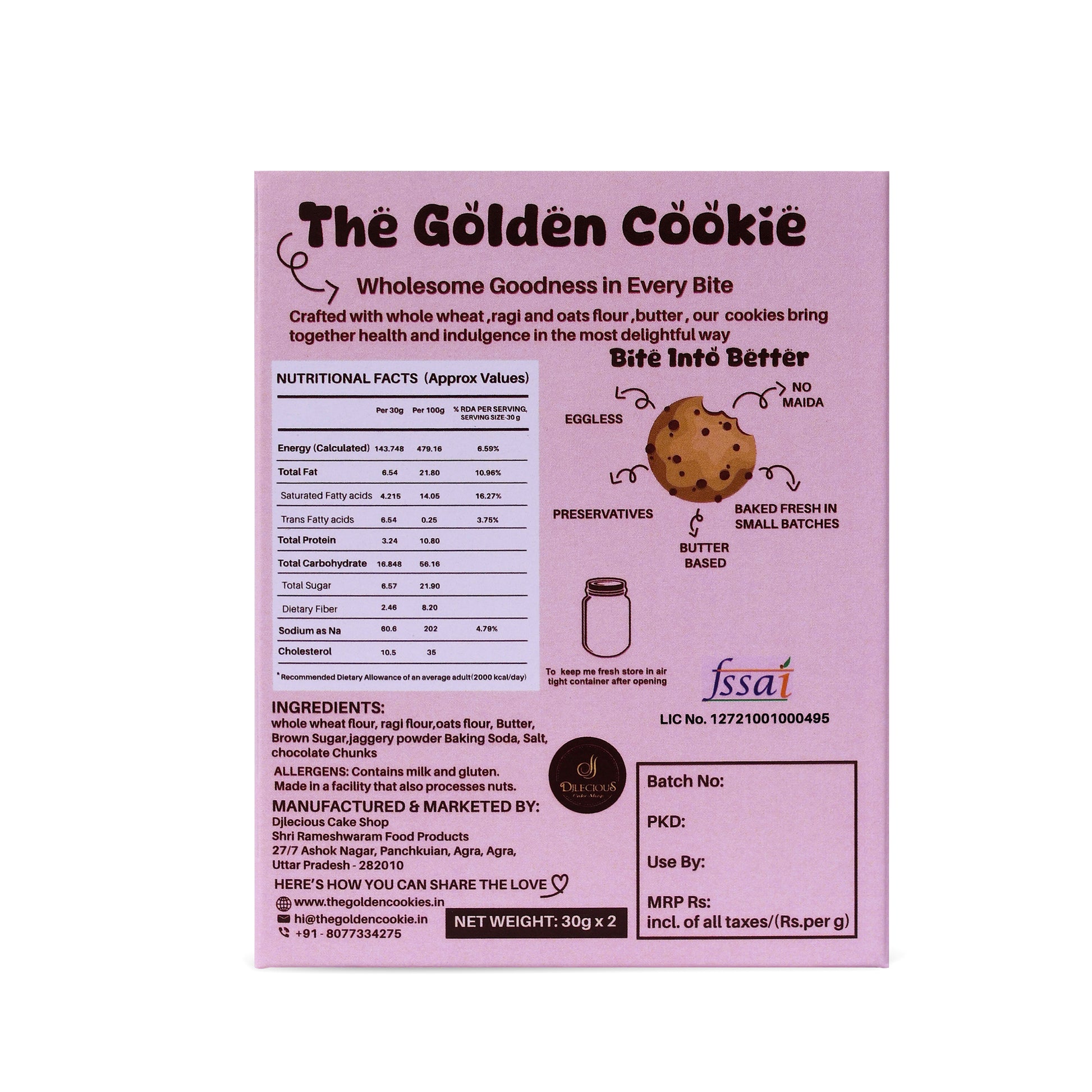 A soft and hearty treat crafted with love – the Ragi Cookie blends wholesome ingredients into a rich, indulgent bite. Made with whole wheat flour ,Ragi flour and oats flour free from preservatives, it’s a cookie that feels like home in every crunch. Perfectly balanced sweetness and a rustic texture make it a timeless favourite.